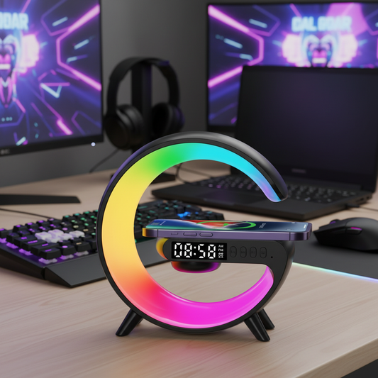 RGB Wireless Charging Stand with Alarm Clock & Bluetooth Speaker – Fast Qi Charger for iPhone, Samsung & Xiaomi